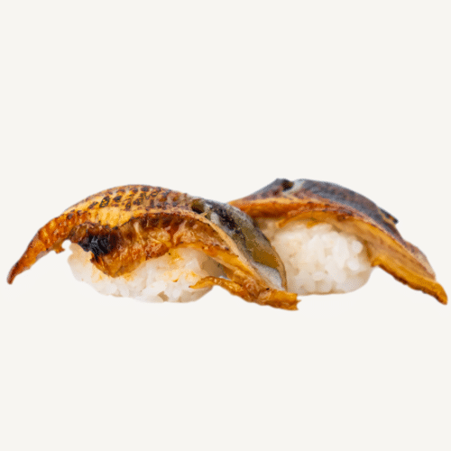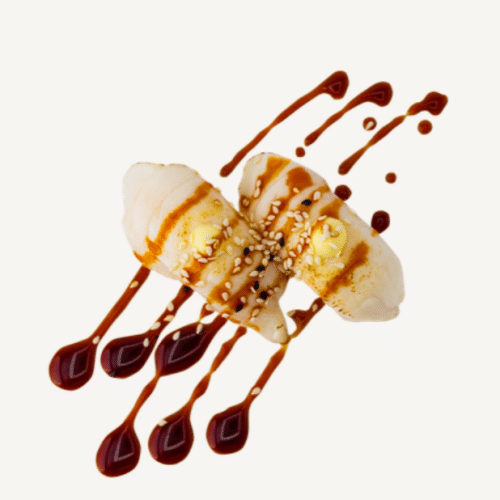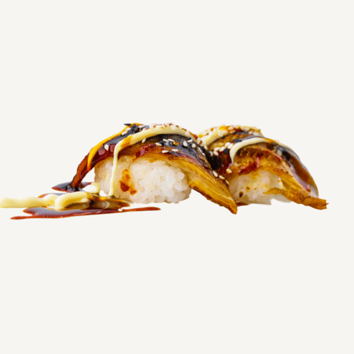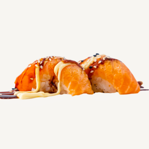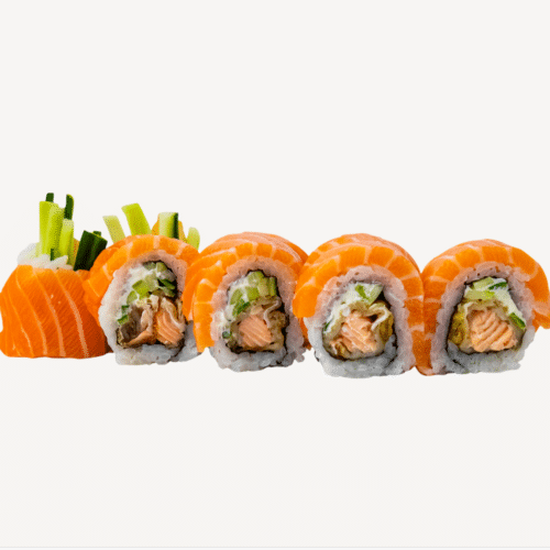 mit knusprigem Lachsbauch, Gurken, Frischkäse flambiertem Lachs, Lauch, Sesam und Unagisauce