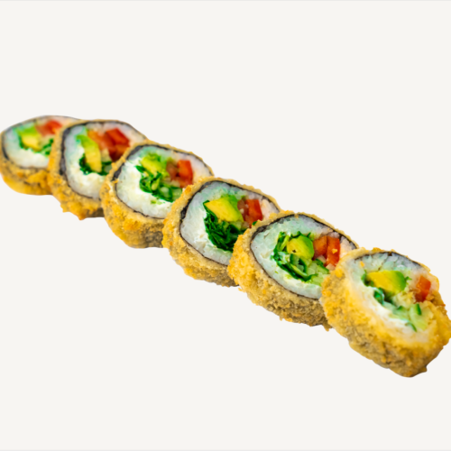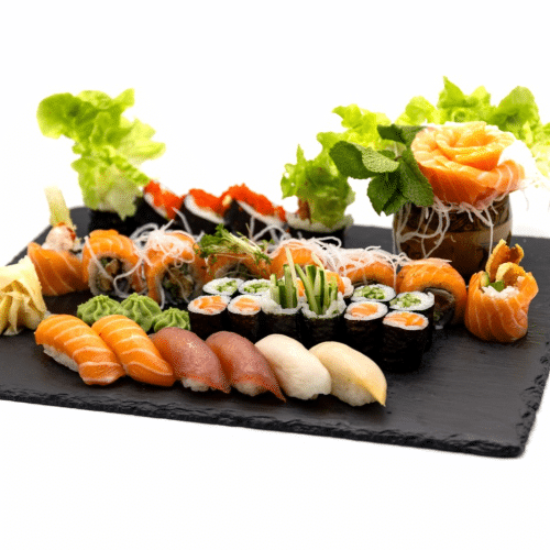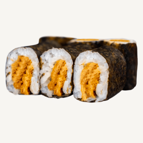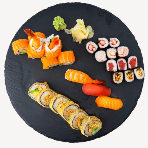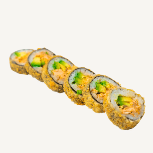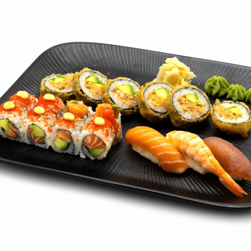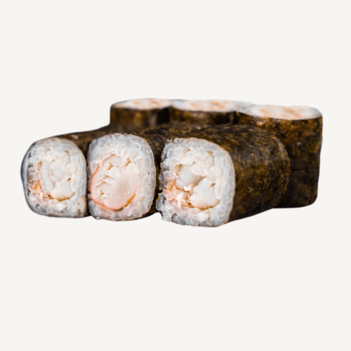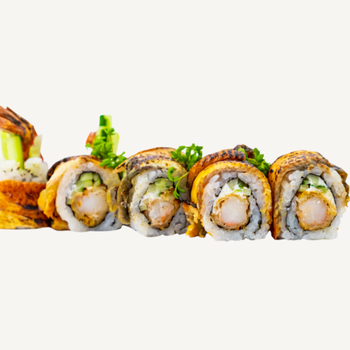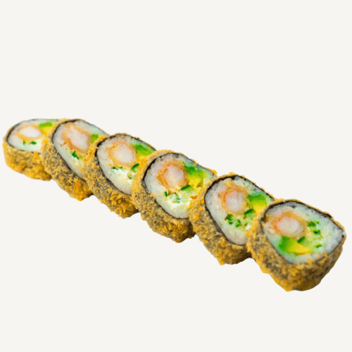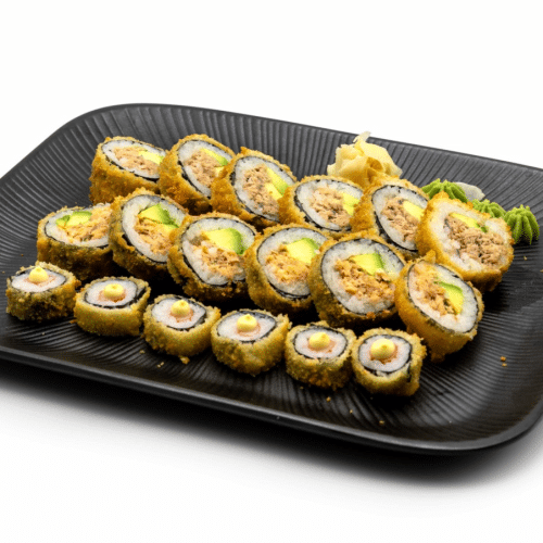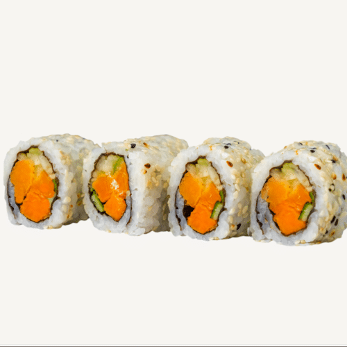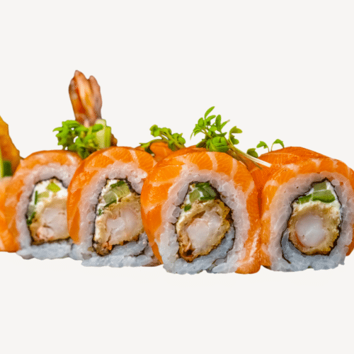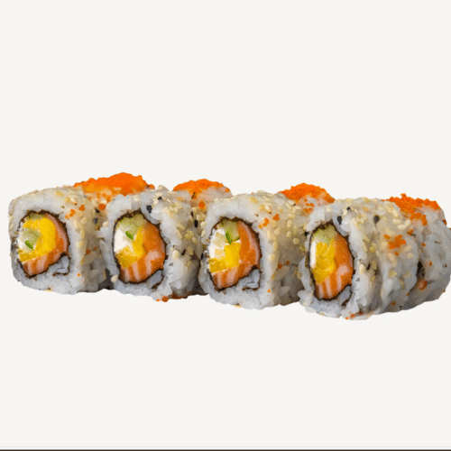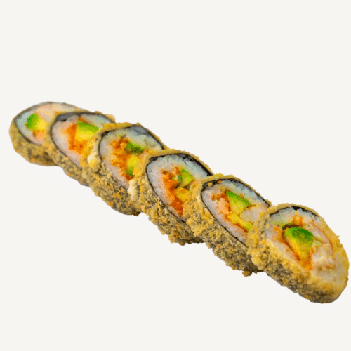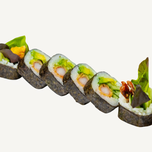 mit knusprigen black Tiger Garnelen, Gurken, Frischkäse, Lachs, Carpaccio, Mayonnaise und Tobiko