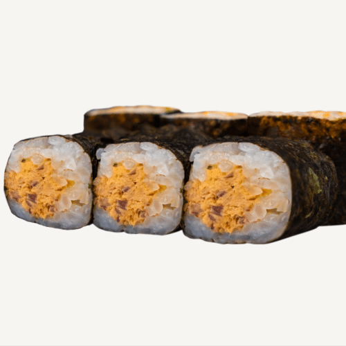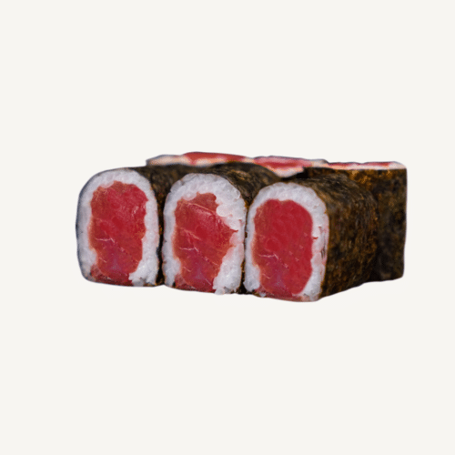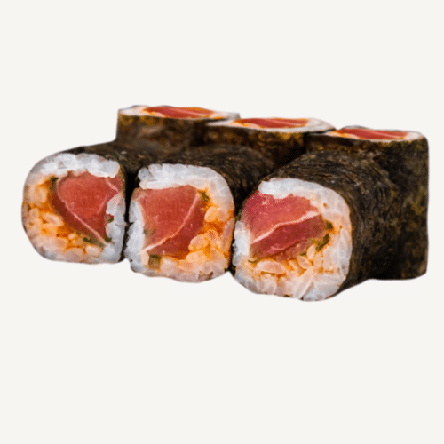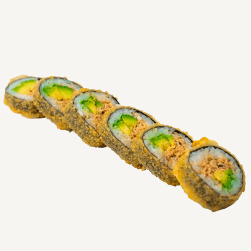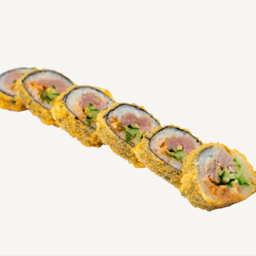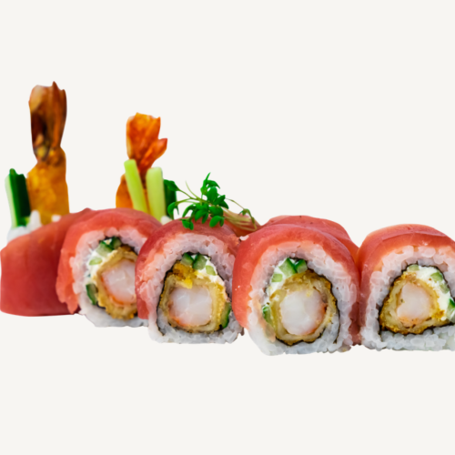 mit knusprigen black Tiger Garnelen, Frischkäse, Gurken, Thunfisch Carpaccio, Mayonnaise und Tobiko