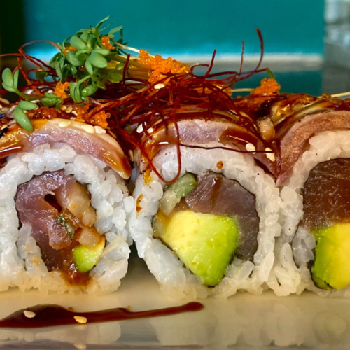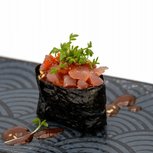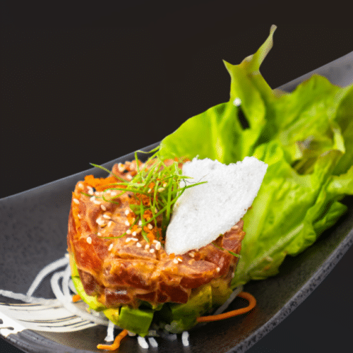 mit Thunfischtartar, Avocado, Gurken, getrockneten Chilis, pikanter Sauce und flambiertem Thunfisch