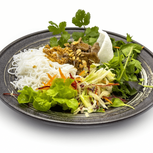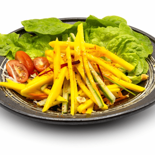 Mangostreifen mit Möhren, Gurken, Minze, gerösteten Erdnüssen, Koriander, Chili-Knoblauch-Vinaigrette und einer Zutat nach Wahl