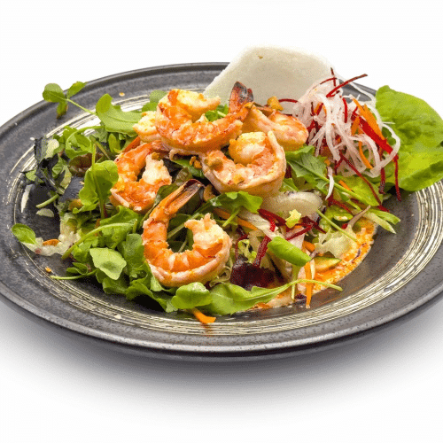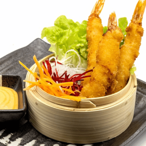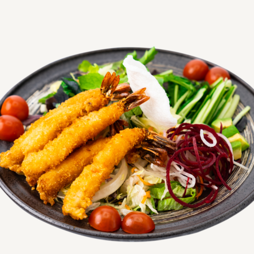 mit knusprigen black Tiger Garnelen, Gurken, Avocado, Salat, Tobiko und Cocktail Spezialsauce