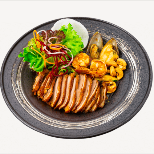 knusprige Entenbrust mit Meeresfrüchten, Gemüse, Cashewnüssen und Hoisinsauce