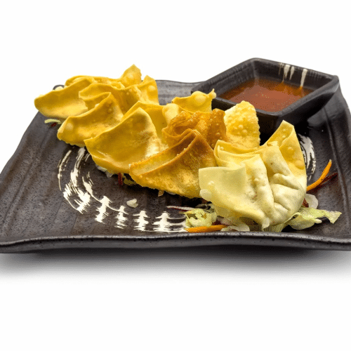 hausgemachte Teigtaschen mit Hühnchenfüllung knusprig gebacken, dazu Sweet-Chili-Sauce