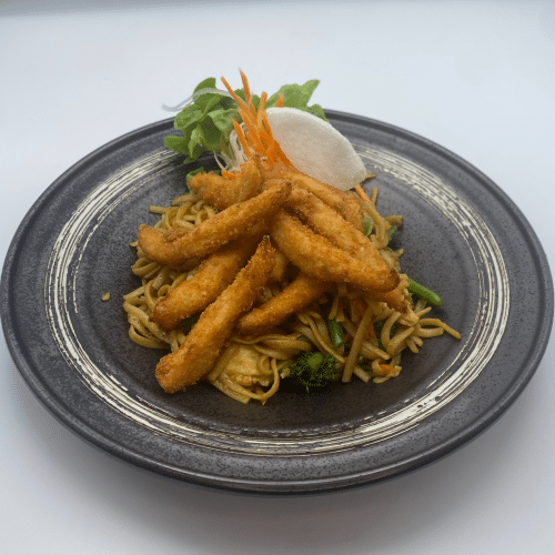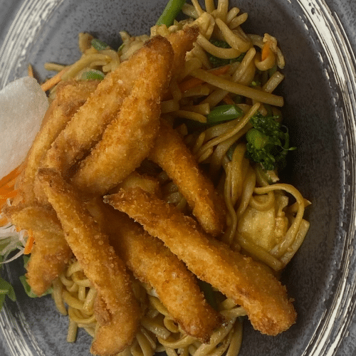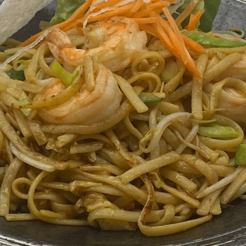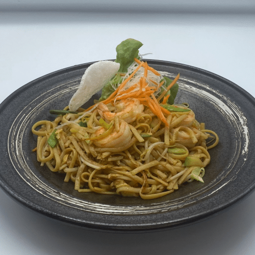 gebratene Nudeln mit Ei, Möhren, Zwiebeln, Sojasprossen und Süß-Sauer-Sauce, dazu eine Zutat nach Wahl