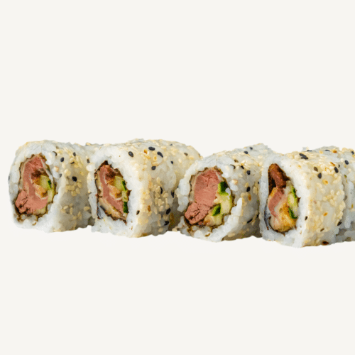 mit Rindfleisch Tempura, Gurken, japanischer Mayonnaise im Lauchmantel, Teriyakisauce und Sesam