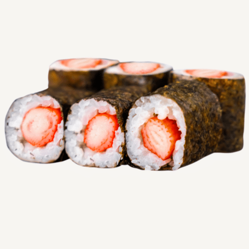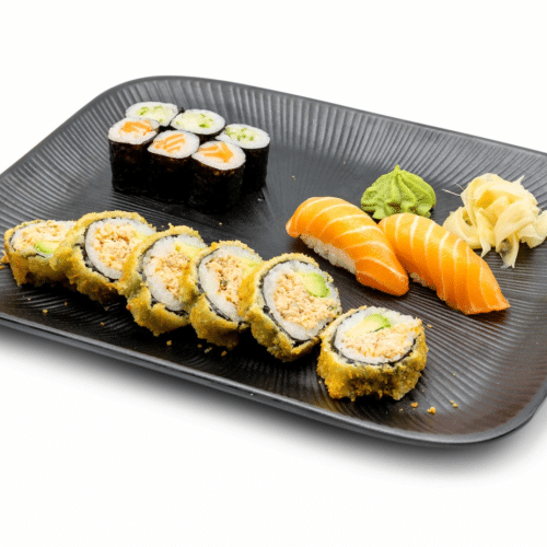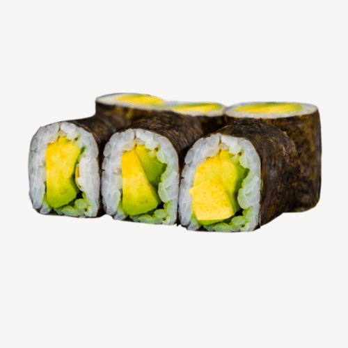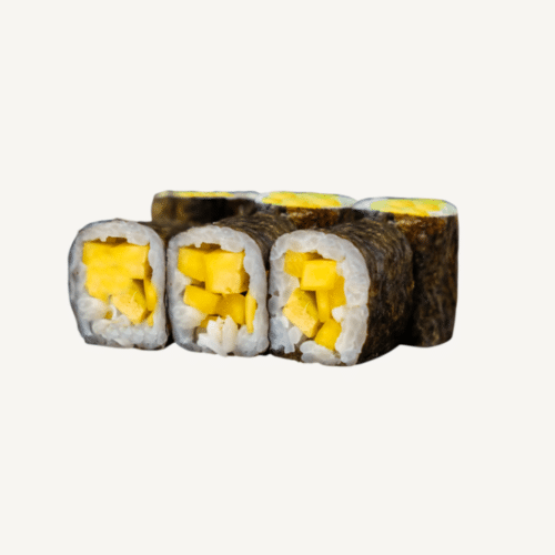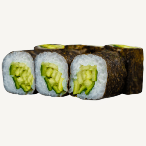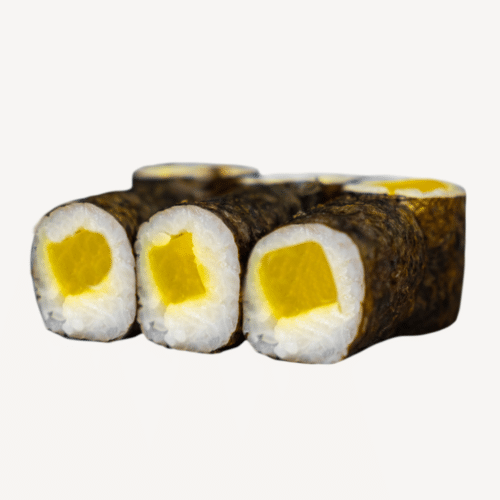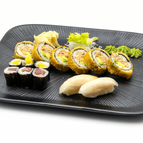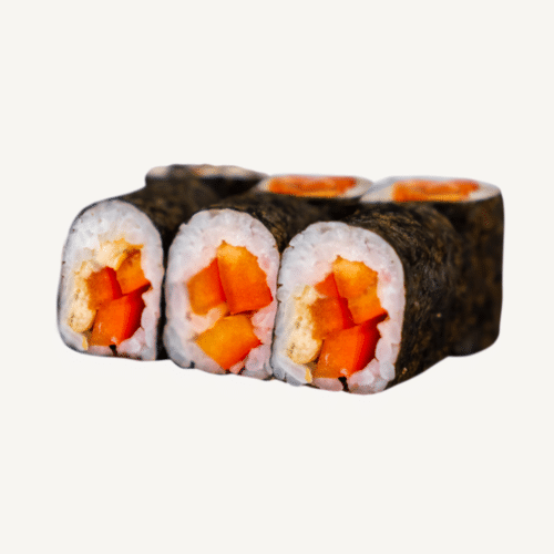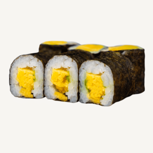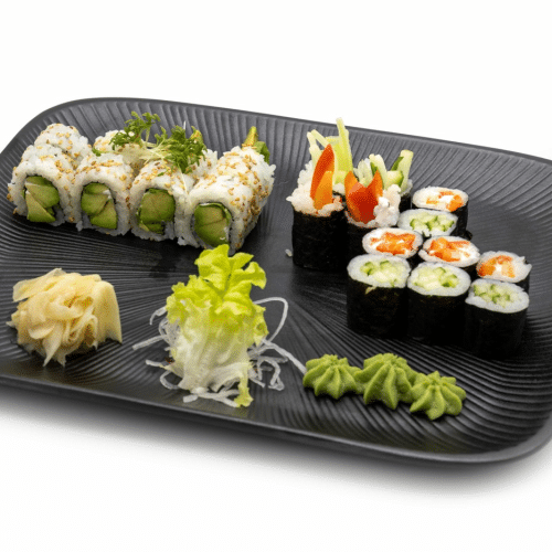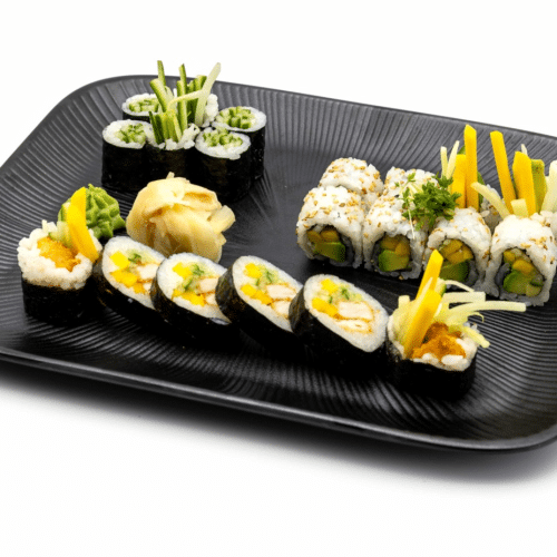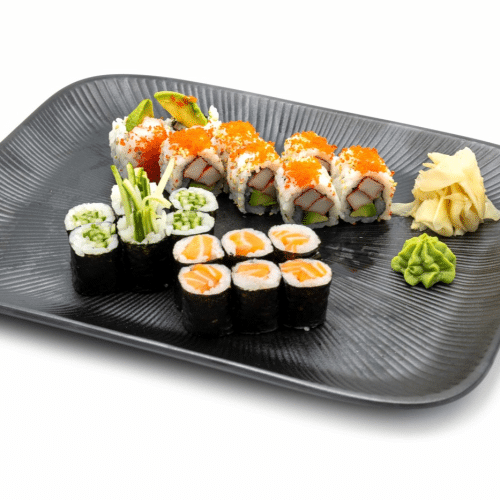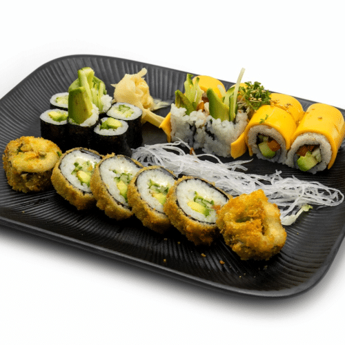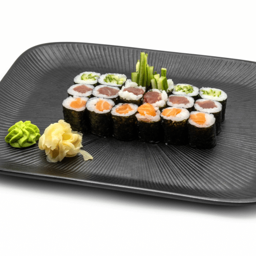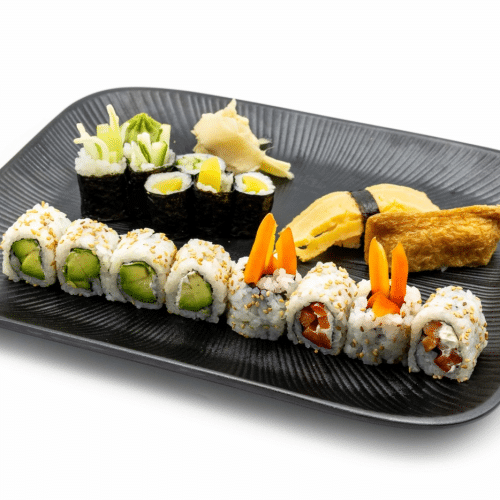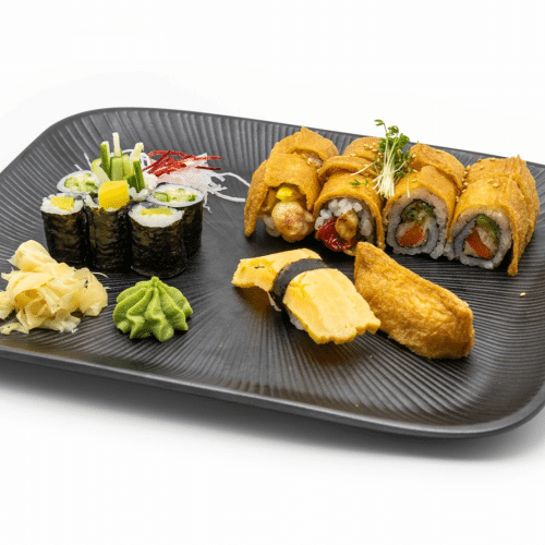 16 Stück: 3 Maki Rettich, 3 Maki Gurke, 8 Inside Out mit Phily Avocado und Phily Paprika, 2 Nigiri Inari Tamago