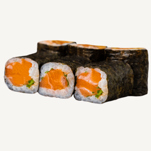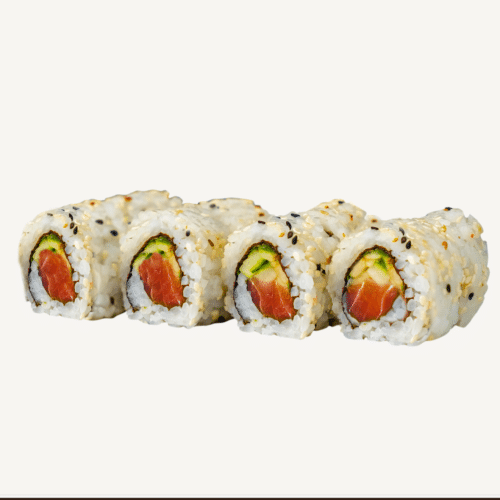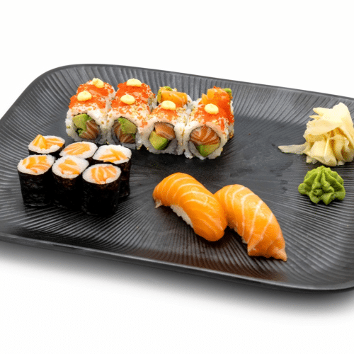 20 Stück: 12 Maki mit Lachs und Gurke, 8 Inside Out California Roll