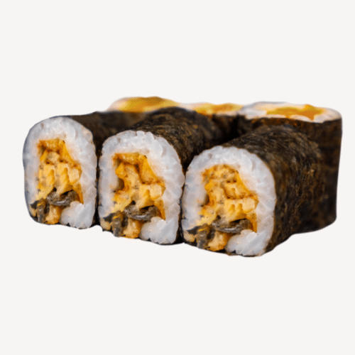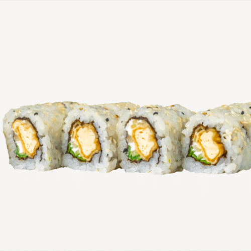 mit knusprigen black Tiger Garnelen, Frischkäse, Gurken und gegrilltem Kabayaki Aal