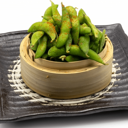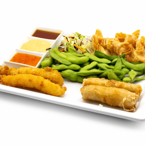 mit verschiedenen Vorspeisen: Frühlingsrollen, wantan, knusprige Garnelen, edamame, sweet-Chilisauce und Cocktailsauce