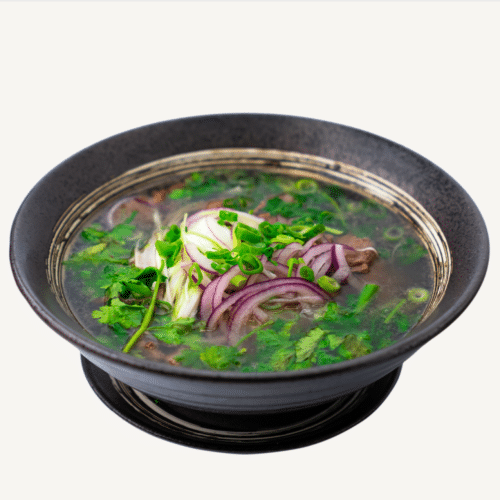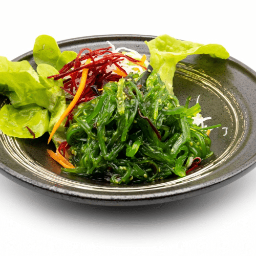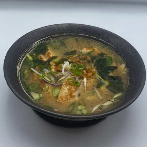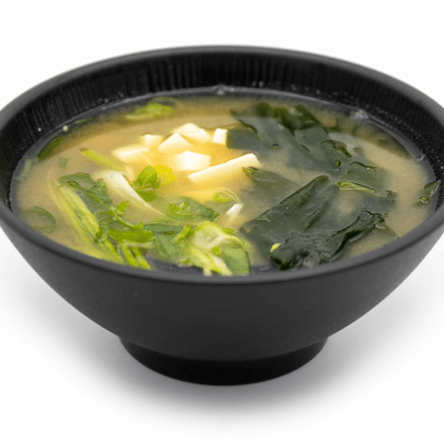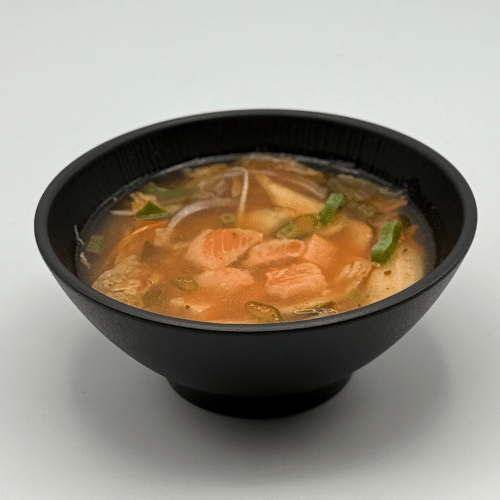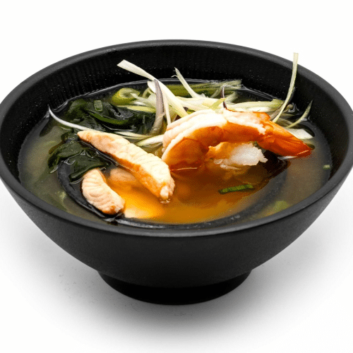 mit Lachs, Butterfisch, Seetang, Lauch und Sojabohnenbrühe