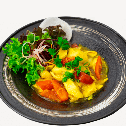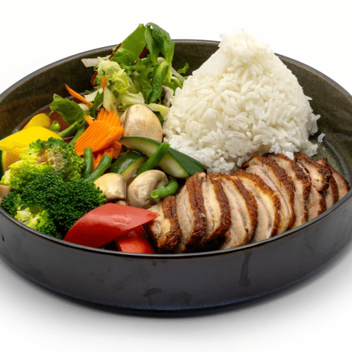 mit zartem Hühnerbrustfilet, Gemüse, Zitronengras, Chilischoten und Reis