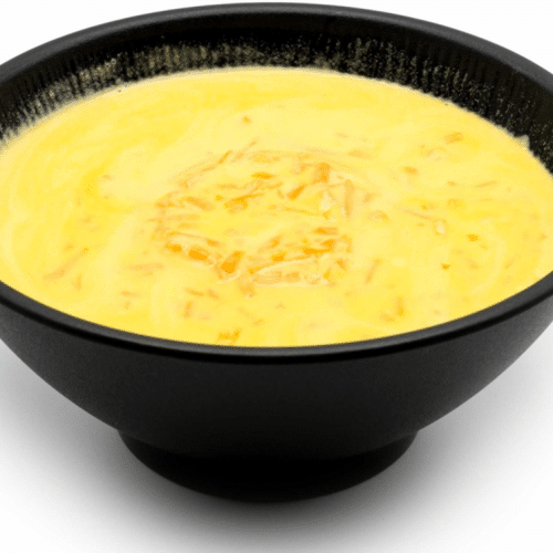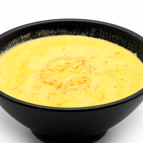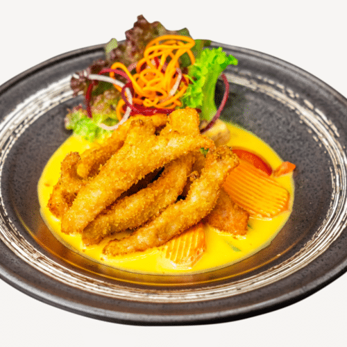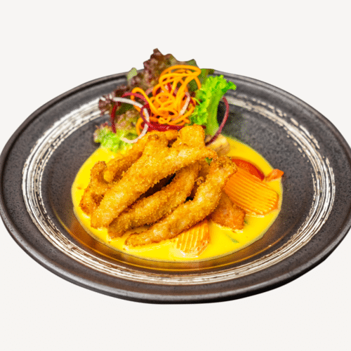 mit pürrierter Mango, Möhren und Kokosmilchfond