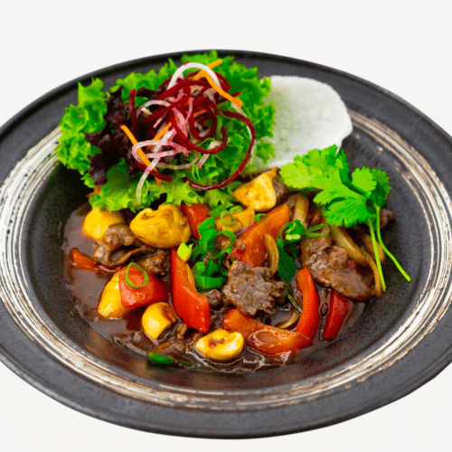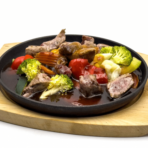 mit gebratenem Rindfleisch, Champignons, Paprika, Zwiebeln und Reis
