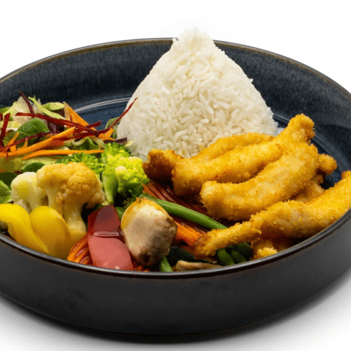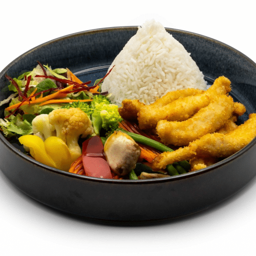 mit Süß-Sauer-Sauce und Reis, dazu eine Zutat nach Wahl