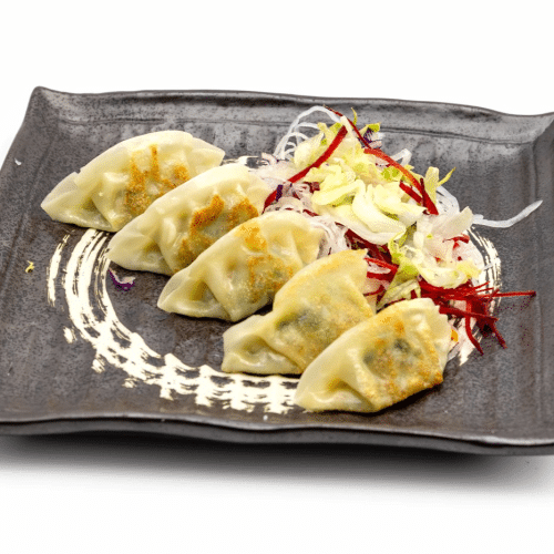 gebratene Teigtaschen mit Unagi-Dip, Sesam und einer Zutat nach Wahl